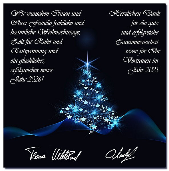 Wir wünschen allen Kunden und Freunden fröhliche und besinnliche Weihnachtstage, Zeit für Ruhe und Entspannung und ein glückliches, erfolgreiches neues Jahr 2026!